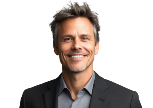 Business portrait isolated on white transparent background: A confident man with graying hair and a neatly trimmed beard smiles warmly at the camera while wearing a dark navy suit, white shirt, and