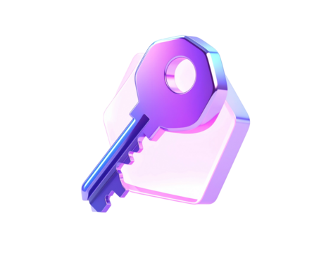A glowing purple key resting atop a clear, hexagonal prism