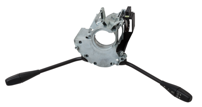 Steering wheel switches for cruise control  disassembled on a white isolated background, spare part for car repair or for sale at junk yard.