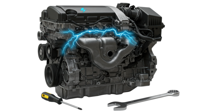 Isolated assortment of new car parts to repair various automotive vehicles, no background