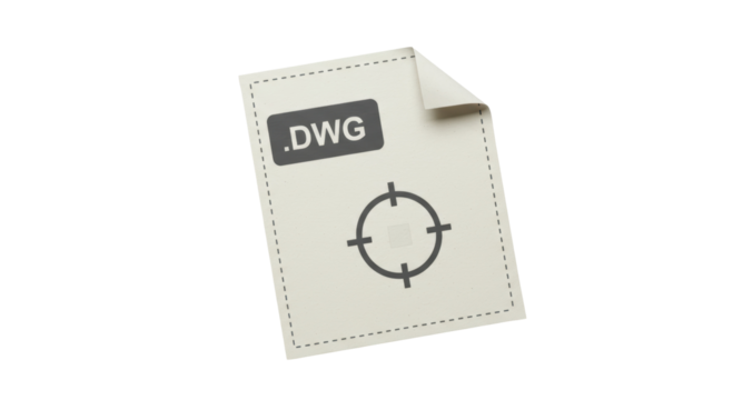 3D File Icon for DWG Format with Target Reticle Symbol on White Paper Document and Blue Ribbon Label Isolated on Transparent Background
