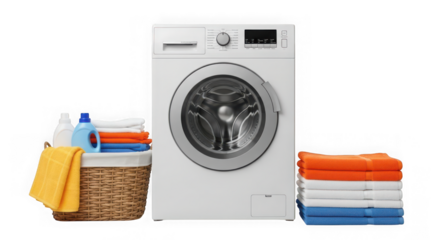 Modern white washing machine with a basket of clean folded laundry and a stack of towels, isolated on transparent background