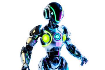 Futuristic AI humanoid robot interacting with holographic interface, in a sleek modern lab setting, blue lighting isolated on solid white background Png