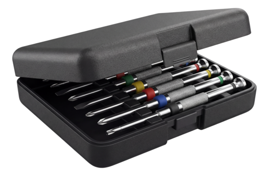 Precision screwdriver set in a durable case for detailed automotive electrical tasks.