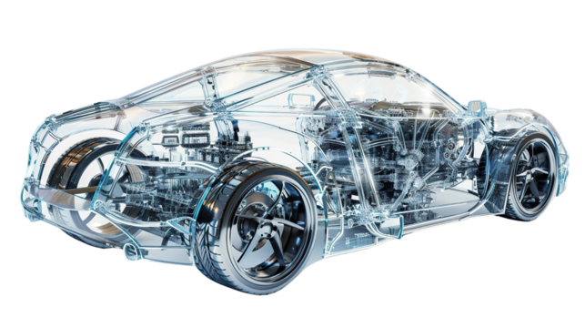 Translucent Robot Cars: Cars with transparent robot structures in a futuristic manner. Makes the interior of the car clearly visible. white background