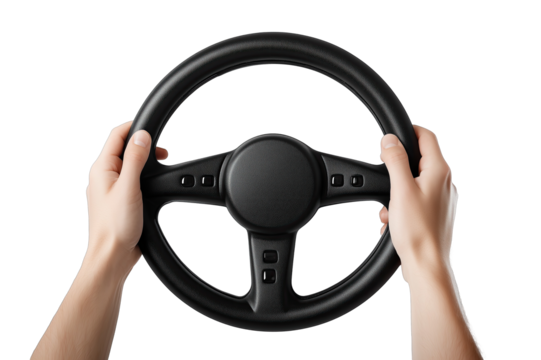 Hands gripping a black steering wheel against a plain white background, symbolizing driving and control
