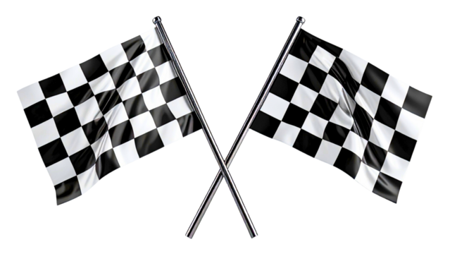 Crossed checkered racing flags for motorsport finish line, speed and competition isolated on transparent background