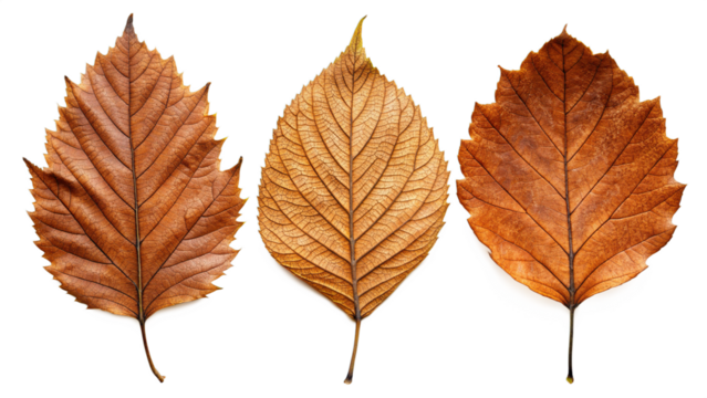 Eight autumn leaves in brown and yellow tones with detailed textures, natural dried foliage arrangement for seasonal decoration isolated on transparent background