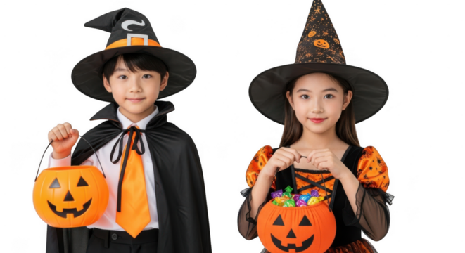Two children dressed as witches with hats and capes, holding pumpkin buckets filled with candy for halloween trickortreating isolated on transparent background