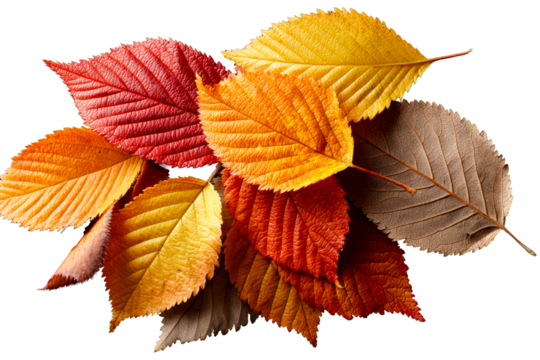 Many vibrant red, orange, and yellow autumn maple leaves are gently falling and scattering, forming a decorative pile, isolated on a clear transparent background.