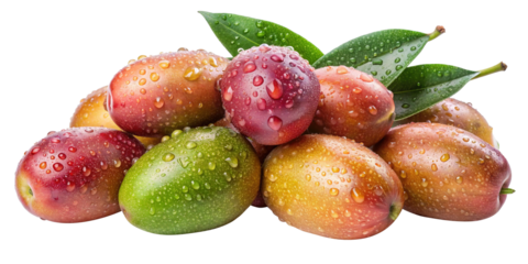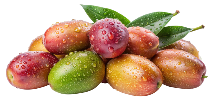 Closeup of a Pile of Juicy Fresh Elaeagnus Multiflora Fruits with Water Droplets and Green Leaves