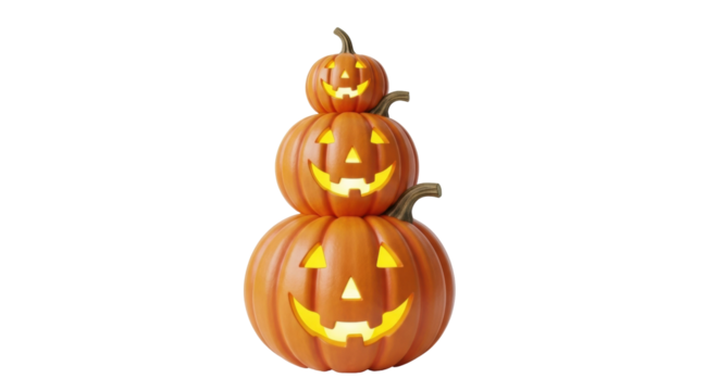 Isolated Halloween pumpkin stack, carved grinning faces for autumn season holiday decoration