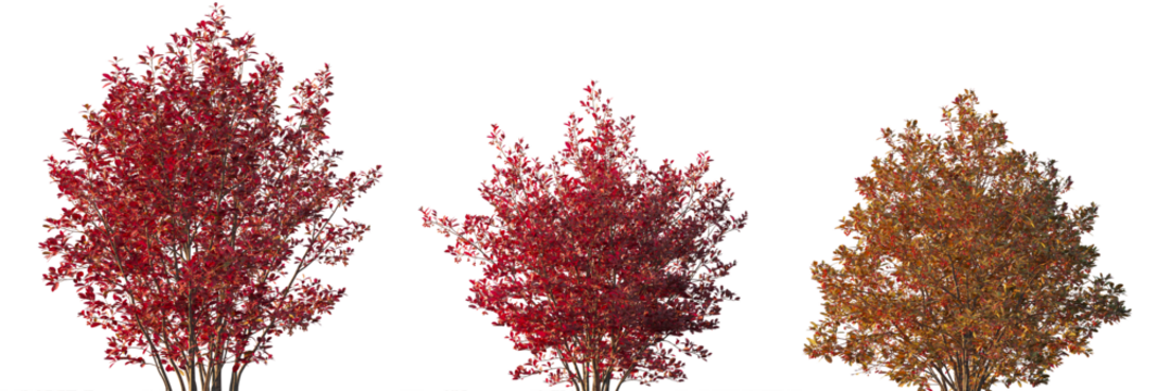 three trees in different stages of seasonal foliage: one with green leaves, one with yellow leaves, and one with orange leaves against a transparent, isolated background