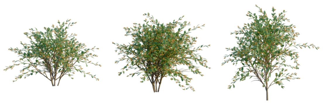 Prunus pumila besseyi tree plan, top view, cutout, transparent background, isolate, Three distinct trees rendered from above with detailed foliage and branches