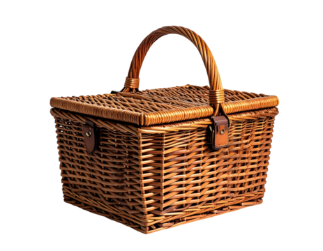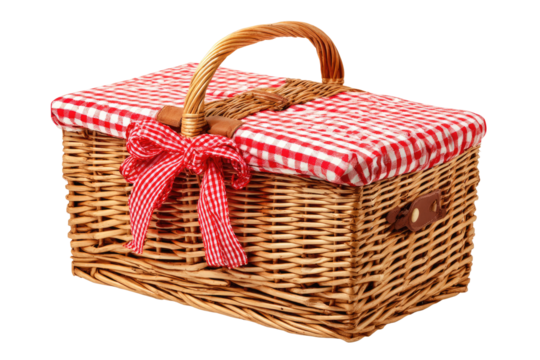 A cozy picnic basket draped with a plaid blanket, surrounded by vibrant autumn leaves, perfect for fall gatherings or outdoor adventures.
