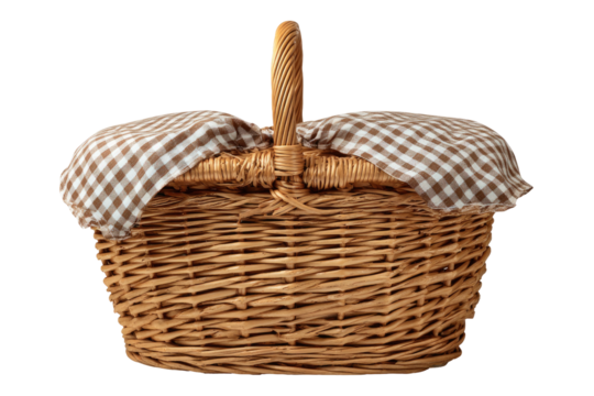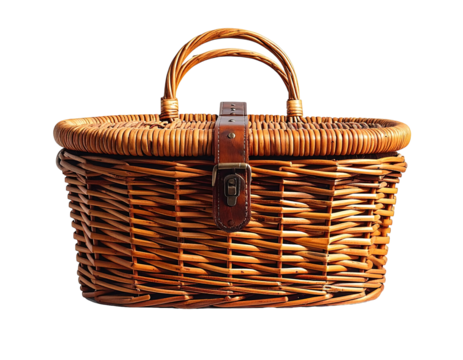 A light brown woven wicker picnic basket, shaped like a small house, with a roof and handles
