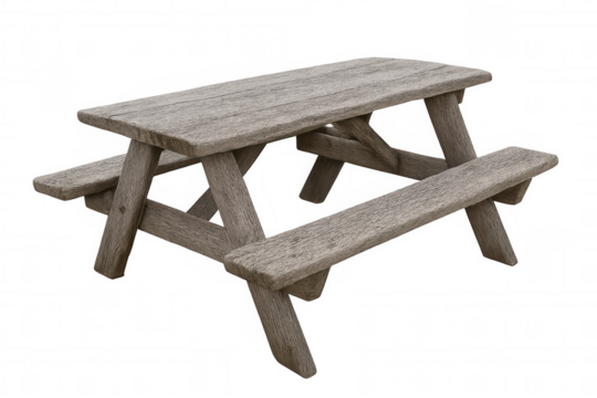 Wooden picnic table with attached benches, casual outdoor rustic dining furniture for park or garden, transparent background