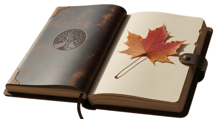 An open vintage leather-bound journal with an embossed tree of life cover and a pressed autumn maple leaf on a blank page.
