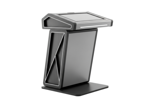 An ultra-modern avant-garde podium of charcoal brushed aluminum & matte composite panels, with an interactive display, against a transparent studio background with copy space. Concept of future