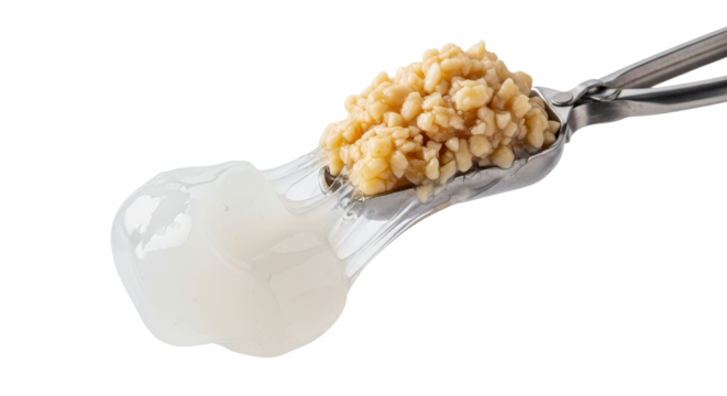 Scoop of molecular gastronomy pearls resting with a gelatinous mass, showcasing culinary science with delicate textures and contrasts against a