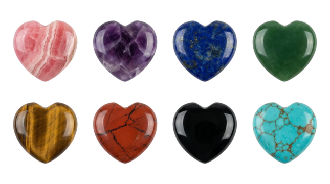 Natural gemstone heart set including amethyst rose quartz lapis lazuli and tiger eye minerals isolated. Polished crystal collection for jewelry and healing.