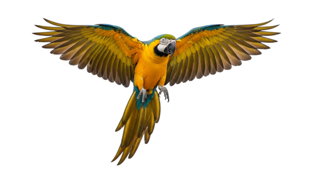 A vibrant macaw with golden and blue plumage takes flight on a black background, wings spread wide.