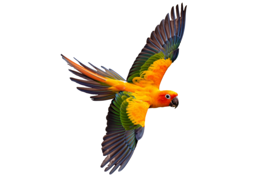 Sun parakeet bird, Aratinga solstitialis, flying, isolated on transparent or white background