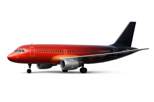 Red commercial passenger jet airplane on a transparent background. Concept for global travel, cargo delivery, and aviation