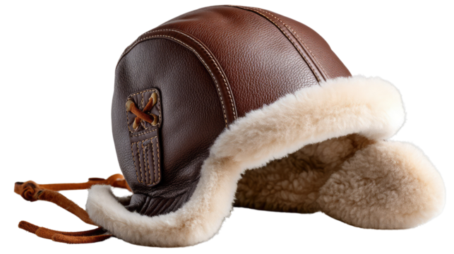 Vintage Aviator's Hat: A classic leather aviator hat with a fur lining, meticulously crafted to embody a sense of adventure and timeless style, invoking the spirit of aviation.