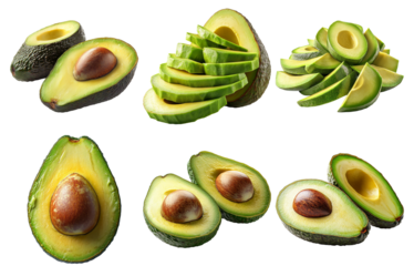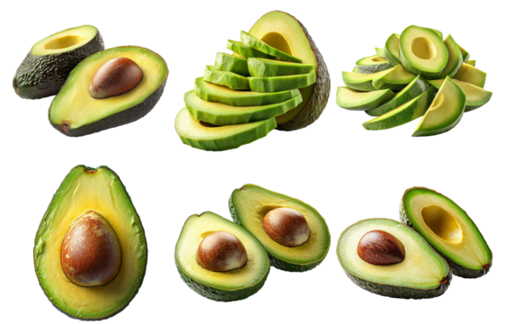 Sliced avocado with various cuts and whole avocados isolated on transparent background