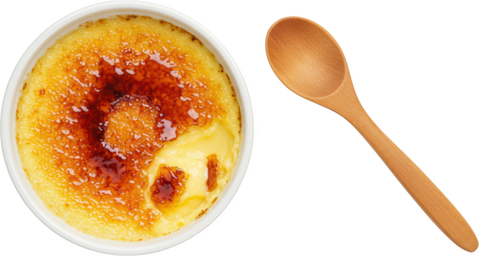 Delicious Cr me br l e dessert in a ramekin with a wooden spoon overhead shot