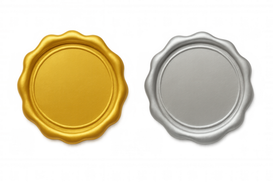 Golden and silver wax seal stamp label isolated, signifying quality, security, and certification on a transparent background