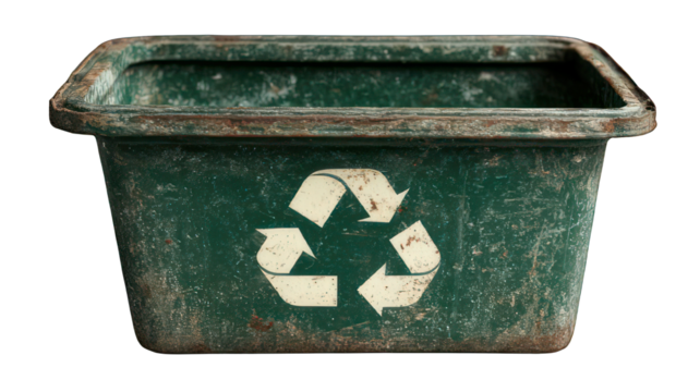 Weathered green recycling bin with faded logo, placed on a textured surface, highlighting sustainability