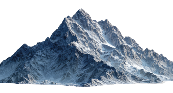 A snow-covered mountain peak with rugged, icy terrain and dramatic shadows