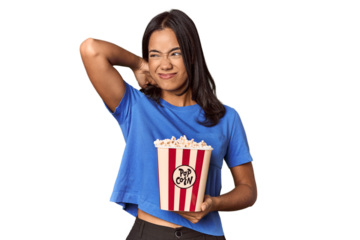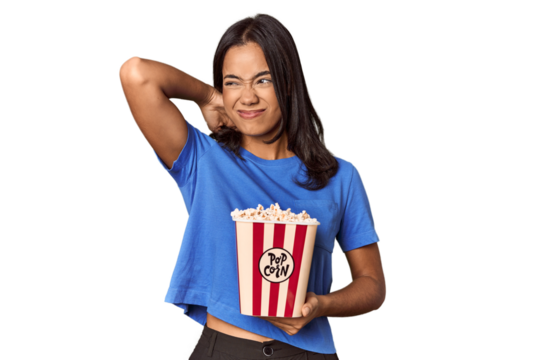 Young woman with popcorn bucket in studio touching back of head, thinking and making a choice.