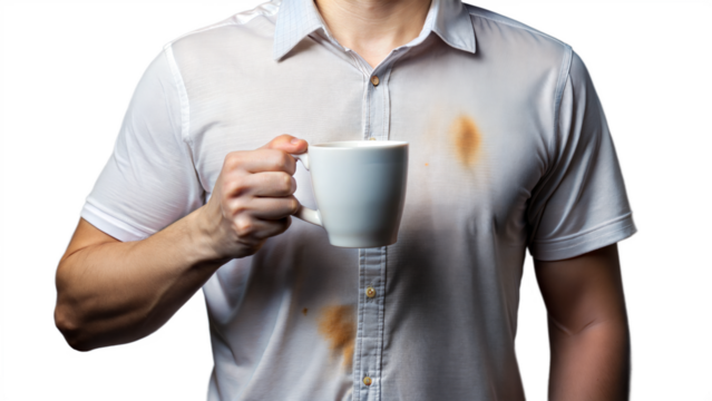 Person with coffee stain on their white shirt holding a white mug, isolated on transparent background