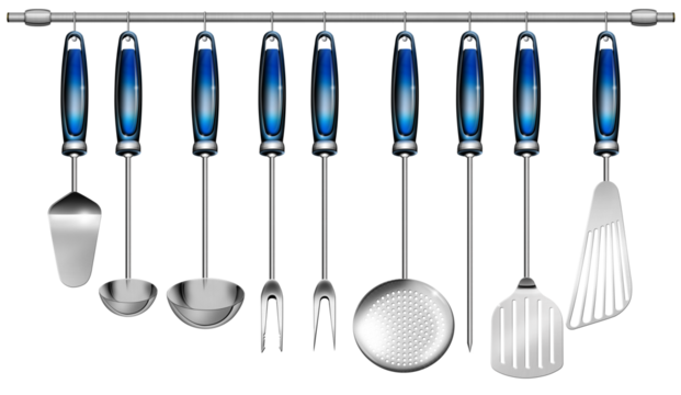3D illustration of a set of nine kitchen utensils hanging on a pole (stainless steel and blue plastic handle), isolated on white or transparent background. Digitally generated image, png.