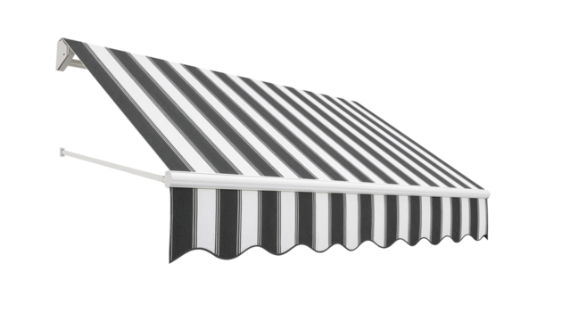 Stylish black and white striped awning protects from sun and rain perfect for shops or patios adding a touch of classic design and functional shade