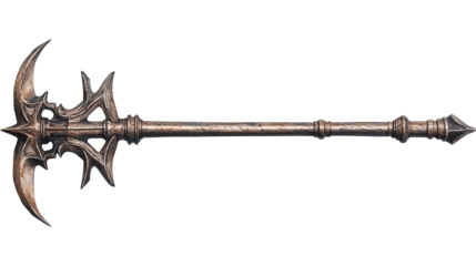 Ornate Fantasy Weapon: A detailed, intricately crafted, and ominous looking fantasy weapon with a bronze finish and a double-bladed, hooked head, perfect for creating mystical scenes in your designs.