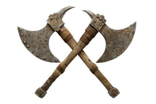 Historic double-headed axes crossed on a rustic backdrop, symbolizing strength and craftsmanship from a bygone era isolated on transparent background