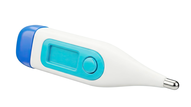 Electronic digital thermometer with button and display screen for precise temperature readings in medicine, isolated on a transparent background