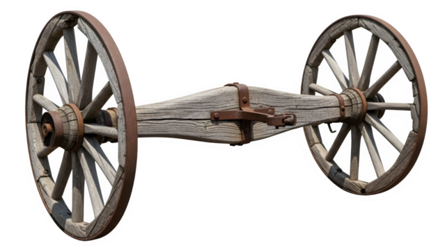 Antique wooden wagon axle assembly featuring weathered spoked wheels and rusted metal hardware