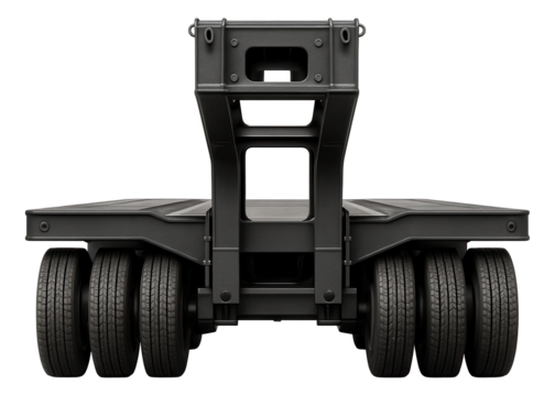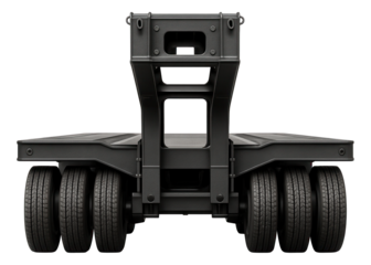 Lowboy trailer with detachable neck and multiple axles for heavy loads.
