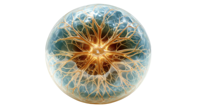 Neural network sphere with glowing dendrites and axons forming a complex brain connection, transparent background