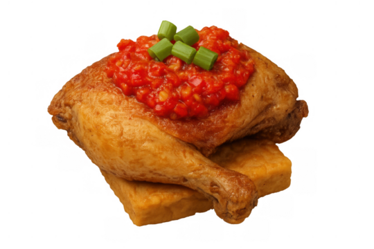 Ayam geprek, indonesian fried chicken leg quarter with spicy sambal chili sauce and crispy crumbs on a transparent background