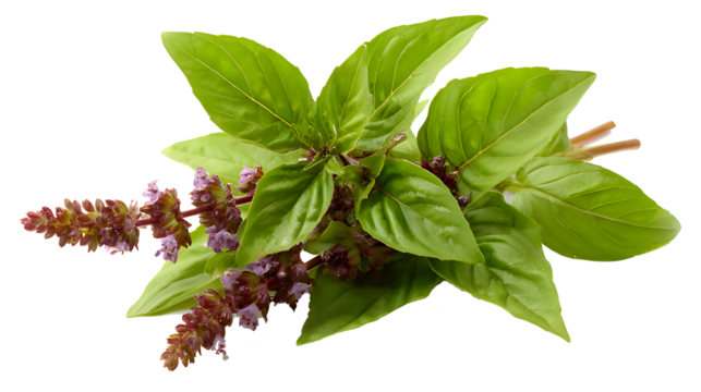 Fresh holy basil leaves with flowers isolated on a transparent background