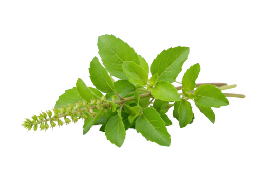 A small bunch of fresh tulsi leaves with a rich green color and small flower buds. isolated on transparent background