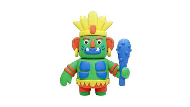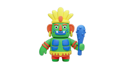 Colorful Aztec-inspired Character Holding a Club on White Background