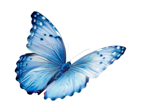 A delicate blue butterfly with translucent wings, captured in flight against a white background. Stunning and ethereal.