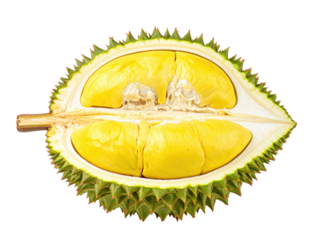 Durian fruit half, yellow flesh, green husk